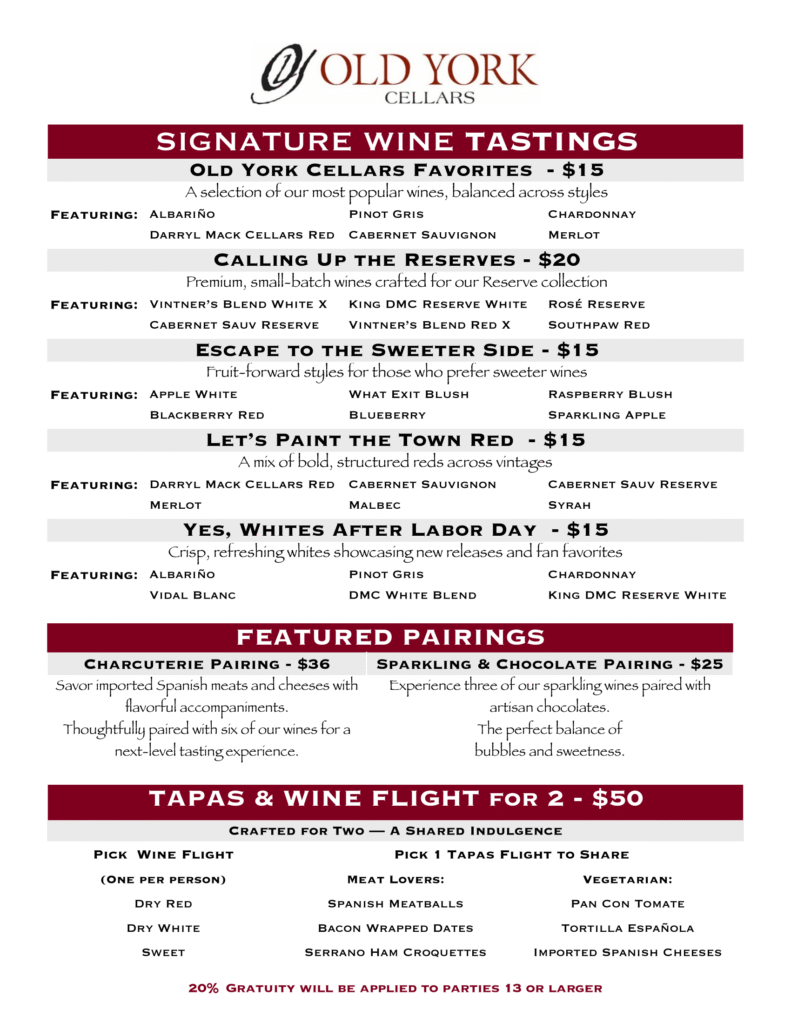 Our Signature Wine & Dine Experiences are the perfect way to elevate your visit to Old York Cellars. .