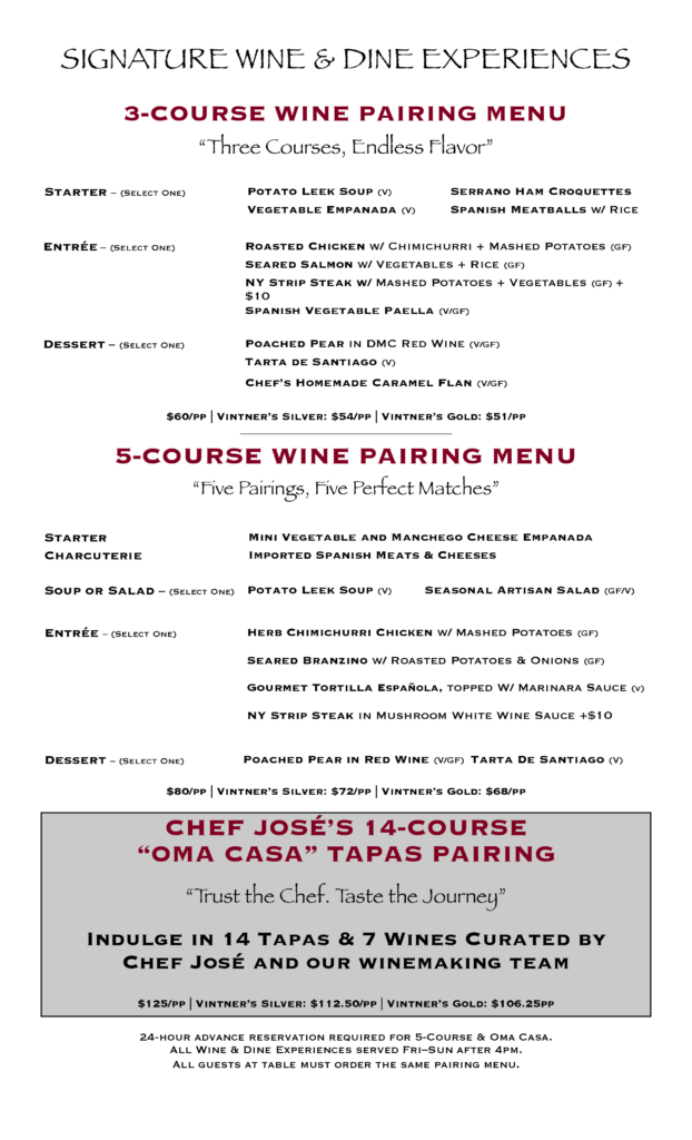 The 3-Course, 5 – Course & 14-Course Wine Pairings are ONLY available with our Signature Wine & Dine Experiences – Advanced Reservations are required for the 5-Course & the 14-Course Wine Pairings.